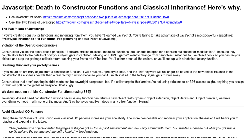 Constructor functions are the equivalent of classes in many programming languages. Sometimes people will refer to them as reference types, classes, data types, or simply constructors. Javascript Constructor Function With Examples Learn Javascript Tutorial Oop Constructor Functions 50 65 Javascript Visualized Prototypal Inheritance What Is A Constructor In Javascript Constructor Functions In Javascript Jogendra Net Javascript Death To Constructor Functions And Classical ... In JavaScript, the thing called this is the object that "owns" the code. The value of this, when used in an object, is the object itself. In a constructor function this does not have a value. It is a substitute for the new object. The value of this will become the new object when a new object ...