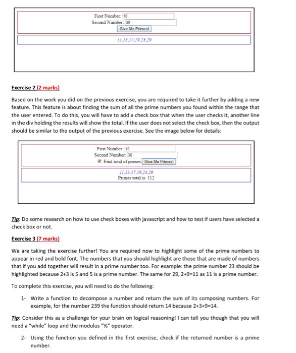 26/2/2020 · Write a JavaScript function that accepts a number as a parameter and check the number is prime or not. Note : A prime number (or a prime) is a natural number greater than 1 that has no positive divisors other than 1 and itself. Pictorial Presentation: Sample Solution: -HTML Code: <!DOCTYPE html> <html> <head> <meta charset=utf-8 /> <title>Check a number is prime or not</title> </head> <body> </body> </html> JavaScript … Converting Variables to Numbers. There are 3 JavaScript methods that can be used to convert variables to numbers: The Number () method. The parseInt () method. The parseFloat () method. These methods are not number methods, but global JavaScript methods. 15/7/2019 · Last Updated : 15 Jul, 2019. A prime number is a number that is divisible by 1 and itself only. First few prime numbers are: 2, 3, 5, 7, 11, 13, 17, …. A JavaScript uses the DOM model to check the input number is prime or not and display its corresponding alert message on the screen.