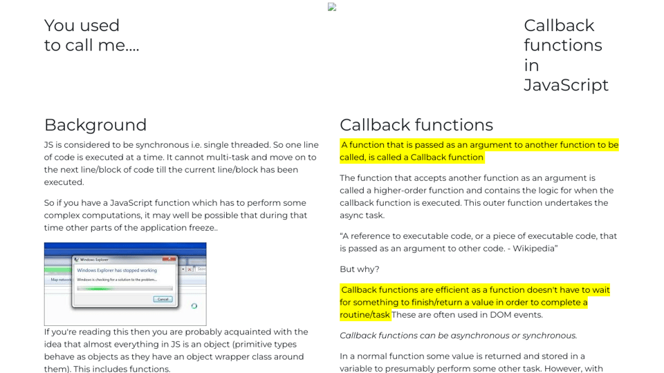 Apr 30, 2020 - Create an asynchronous function in NodeJS that will wait for the process to finish and then proceed to the next iteration. ... when a function takes a long time to execute, javaScript waits for the execution to get over and then moves to the next line true or false Javascript Wait For A Function To Finish Code Example Callback To Async Await Concepts Synchronous Code By Write Asynchronous Code In A Breeze With Async And Await How To Wait For A Function To Complete Its Execution In Answer. A global variable is one way, but you should not get into the habit of using global variables for things like this. Much better is to store that variable in the scope of what is using it. The element itself is a good a place as any: Just a sidenote: This isn't a great way to do animation, for one thing a 1 millisecond rate is going to ...