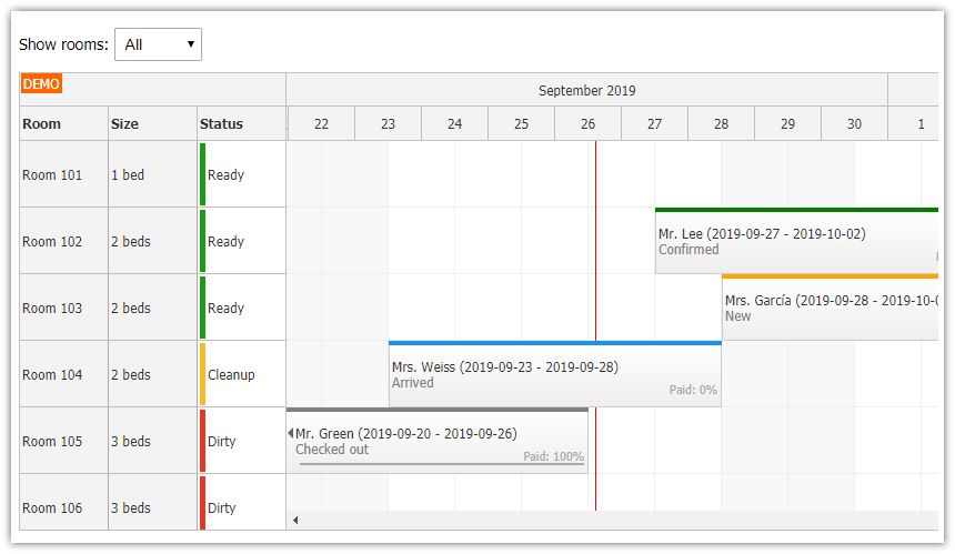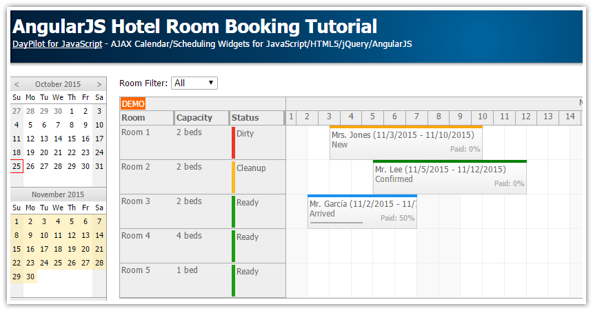 #javascript #javascripttutorial #javascriptcalendar #pluginLearn Javascript calendar,events,booking and scheduler with date picker plugin using HTML and CSS ... After we connect list of rooms to the timeline view, we'll be able to see the following calendar and drag bookings between rooms: Another small thing we can do is to set the default values, such as booking status, paid status or a default text.