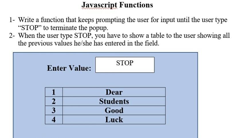 Use the return value of the function to stop the execution of a form in JavaScript. <form onsubmit = "event.preventDefault(); myValidation();"> The JavaScript function would be like the following − Set a function to run on a timer - var timer = setInterval (FUNCTION, 1000). Then clear it to stop - clearInterval (timer) Run the script with workers that can be terminated. Use window.stop () to prevent the page from loading and running. Below is a Javascript function that (from the callers perspective) is in fact a true pause: /*. * This function will not return until (at least) * the specified number of milliseconds have passed. * It does a busy-wait loop. */. function pause (numberMillis) {. var now = new Date ();
