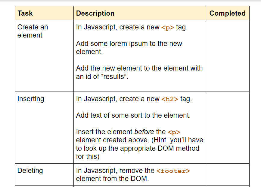 May 19, 2020 - First, select the ul element by its id by using the querySelector() method. Second, declare an array of languages. Third, for each language, create a new li element with the textContent is assigned to the language. 1 week ago - The new Element. Note: A new HTMLElement is returned if the document is an HTMLDocument, which is the most common case. Otherwise a new Element is returned. // The old way: var a = document.createElement('a'); a.setAttribute('class', 'foo'); a.setAttribute('href', '/foo.html'); a.appendChild(document.createTextNode("Next page")); // The new way: var a = new Element('a', { 'class': 'foo', href: '/foo.html' }).update("Next page"); Prototype JavaScript ...
