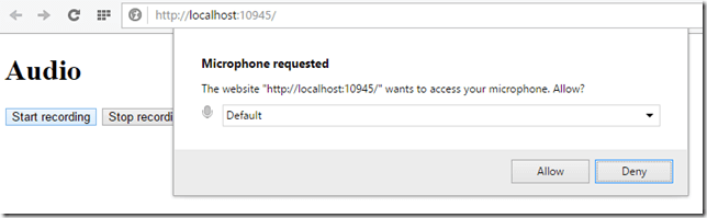 28/4/2015 · In this post, we will see how to record the sound of the microphone. The first thing is to ask the user's consent to use the microphone: navigator. getUserMedia = navigator. getUserMedia || navigator. webkitGetUserMedia || navigator. mozGetUserMedia || navigator. msGetUserMedia ; navigator. getUserMedia ( { audio: true }, function ( e) { // ... Recording process Users should allow microphone access when browser asks them permission to do it. Actual recording process will start when user first allows it. Recording is being processed in stereo WAV blob, and is converted to mono WAV file when recording stopped for minimizing requiring disk and memory space usage. If you only want to record audio, just record without a video source and it will make a blank video with your recording. If you want to record only speaker output and not the mic, simply mute the microphone with a press of a button. Intuitive. (Note this gives you a video file.