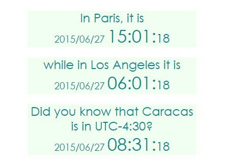 Now that we know how to reliably get the date and time of any location thanks to Google Time Zone API, we can do with it anything the standard JavaScript Date object grants us. A popular extension is to show that time in, well, real time: Example: Tokyo Time: LA Time: Toronto Time: Paris Time: Here is function currentlocaltime () behind the magic. Javascript Program to Display Current Date. In this example, you will learn to write a JavaScript program that will display the current date. To understand this example, you should have the knowledge of the following JavaScript programming topics: JavaScript Date and Time; Example : Display Current Date Display Date and Time using Javascript, php or Server Side Includes (SSI) Display Date and Time using Javascript (Client-side) First we need to define where the date/time should be shown in the HTML page by adding an id to an e.g. <span> or <p> element.