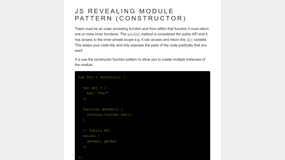 Javascript Module Pattern: Sidenote: ES6 introduced a new feature in JS called 'modules', they're essentially a syntax for importing and exporting code between JavaScript files. They're powerful and bring a new horizon for JS development but it's not the subject today. Today we will talk about IIFEs or Immediately Invoked Functions Expressions, working with vanilla JS we can… The main purpose of the revealing module pattern is to keep data encapsulated, but the top level of an ES6 module is already private - variables defined in it do not leak to the global scope (unless you assign to the global object explicitly, like window.foo = 'foo').. So, in an ES6 module, there's not really any point to the revealing module pattern - feel free to define whatever you want on ...